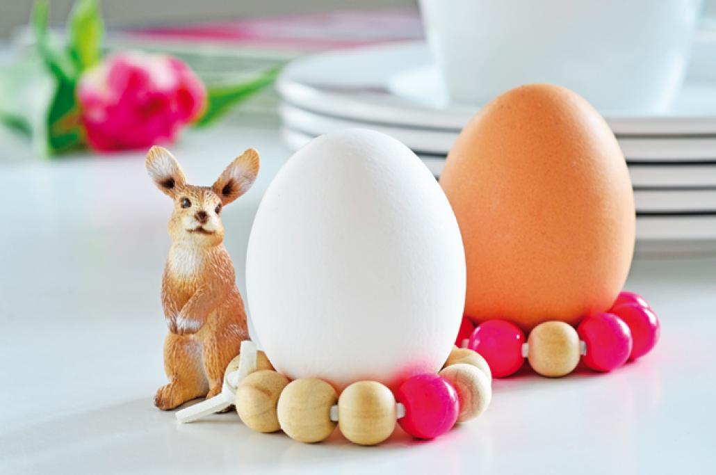 Perlen auf ein Lederband fädeln und die Enden verknoten. Für mittelgroße Frühstückseier benötigt man ca. 11 Perlen bei einem Perlendurchmesser von 12 mm. Da kann zum Osterfrühstück auch gerne mal ein Gast mehr kommen: Die „Perlenkette“ ist schnell gemacht!