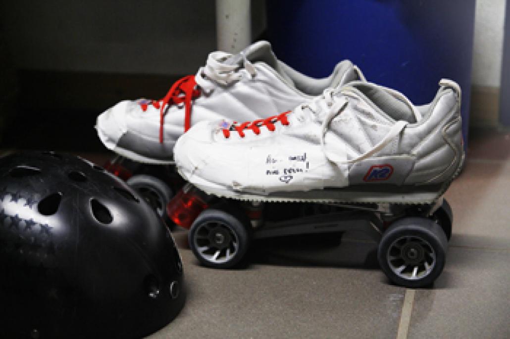 „Du bist dann wohl der Neue“, begrüßt sie mich mit einem diabolischen Lächeln, nimmt mich mit in die Umkleidekabine und übergibt mir meine Ausrüstung: Knie-, Handgelenk-, Ellenbogenschützer, Helm und rot-weiße Rollschuhe. Es braucht 15 Minuten, bis ich die komplette Montur angezogen habe. Dann begebe ich mich auf wackligen Beinen – mein letztes Mal auf Skates ist gefühlte zwölf Jahre her – zurück in die Halle. So müssen sich Kleinkinder fühlen, die gerade das Laufen lernen.