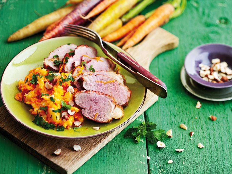 - Das Gemüse abtropfen lassen, die Butter zugeben und zu einem Stampf zerdrücken, mit Salz und Pfeffer würzen. Die Entenbrust aus dem Ofen nehmen, in Scheiben schneiden und mit dem Stampf und der Soße anrichten. Restliche Orangenschale, Haselnusskerne und Petersilie darüberstreuen und servieren.