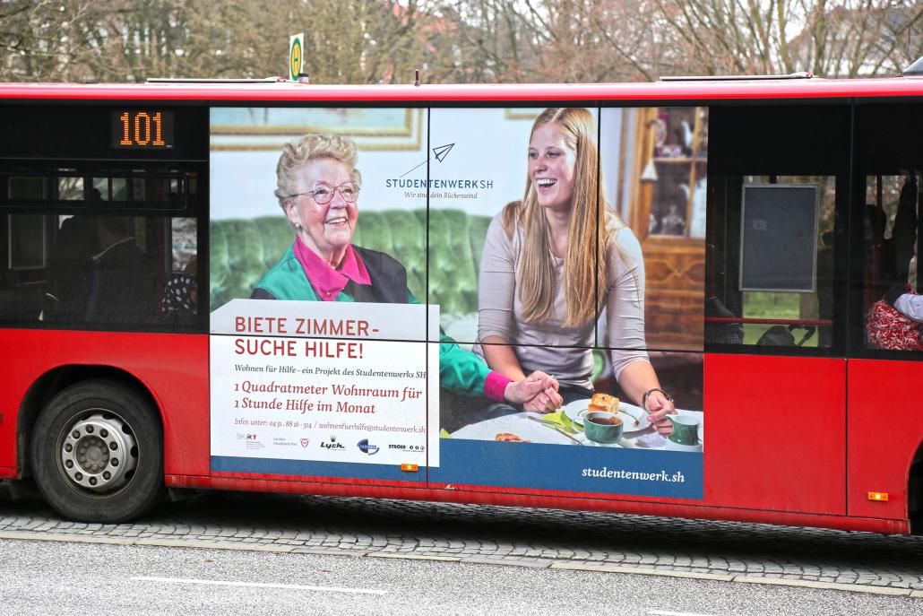 Das großflächige Traffic Board auf der Fahrbahnseite des KVG-Busses ist nicht zu übersehen. „Biete Zimmer – Suche Hilfe!“ lautet das Motto des vom Studentenwerk SH initiierten sozialen Wohnprojekts, das seit dem 27.03.2017 als rollende Werbung in Kiel auf sich aufmerksam macht. Noch bis Ende Oktober wird der Gelenkbus Tag für Tag auf verschiedenen Linien im ganzen Stadtgebiet unterwegs sein.