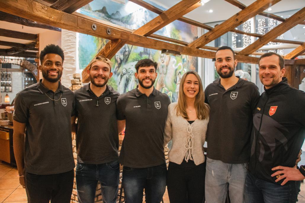 - Redakteurin Finja zusammen mit den Spielern Diego, João, Olavo und Júnio (v. l.) sowie Trainer Eric im brasilianischen Restaurant Cabana Rodizio (Bild: KIELerleben)