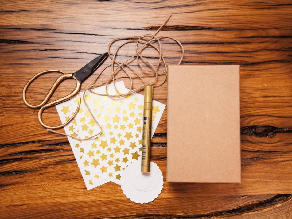 - Schritt 2: Sternchenaufkleber auf das eingepackte Geschenk kleben (Bild: Kathrin Knoll)