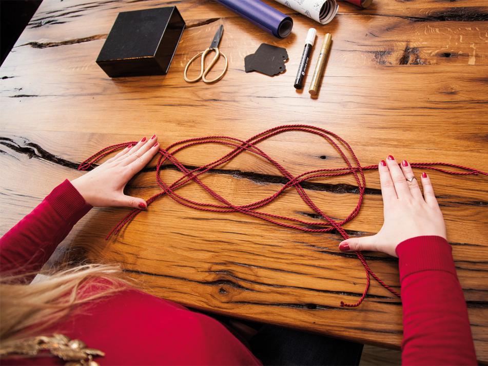- Schritt 3: Den Knoten zuziehen und im Anschluss am Geschenk befestigen (Bild: Kathrin Knoll)