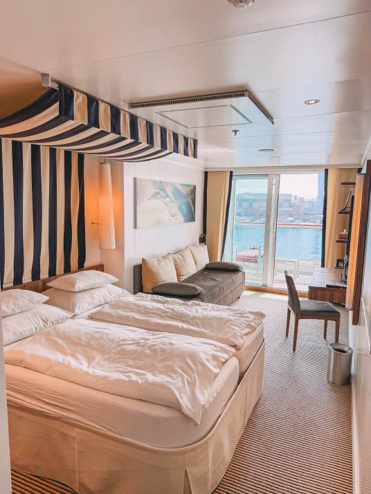 Schon beim Betreten von AIDAprima am Ostseekai in Kiel wird klar: Hier beginnt eine kleine Reise in eine eigene Welt auf dem Wasser. Der erste Stopp führt direkt in das Wohlfühlzuhause auf dem Meer, den Kabinen. Besonders die Außenkabinen mit Balkon sorgen direkt für dieses Gefühl, mittendrin auf dem Wasser zu sein.